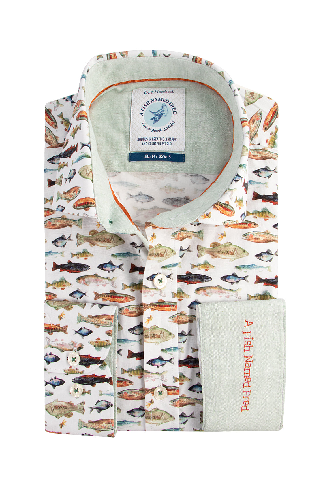 This one's for the outdoorsmen! Casual fish print shirt from A Fish Named Fred. Printed with a variety of species, let the world see your adventurous side.