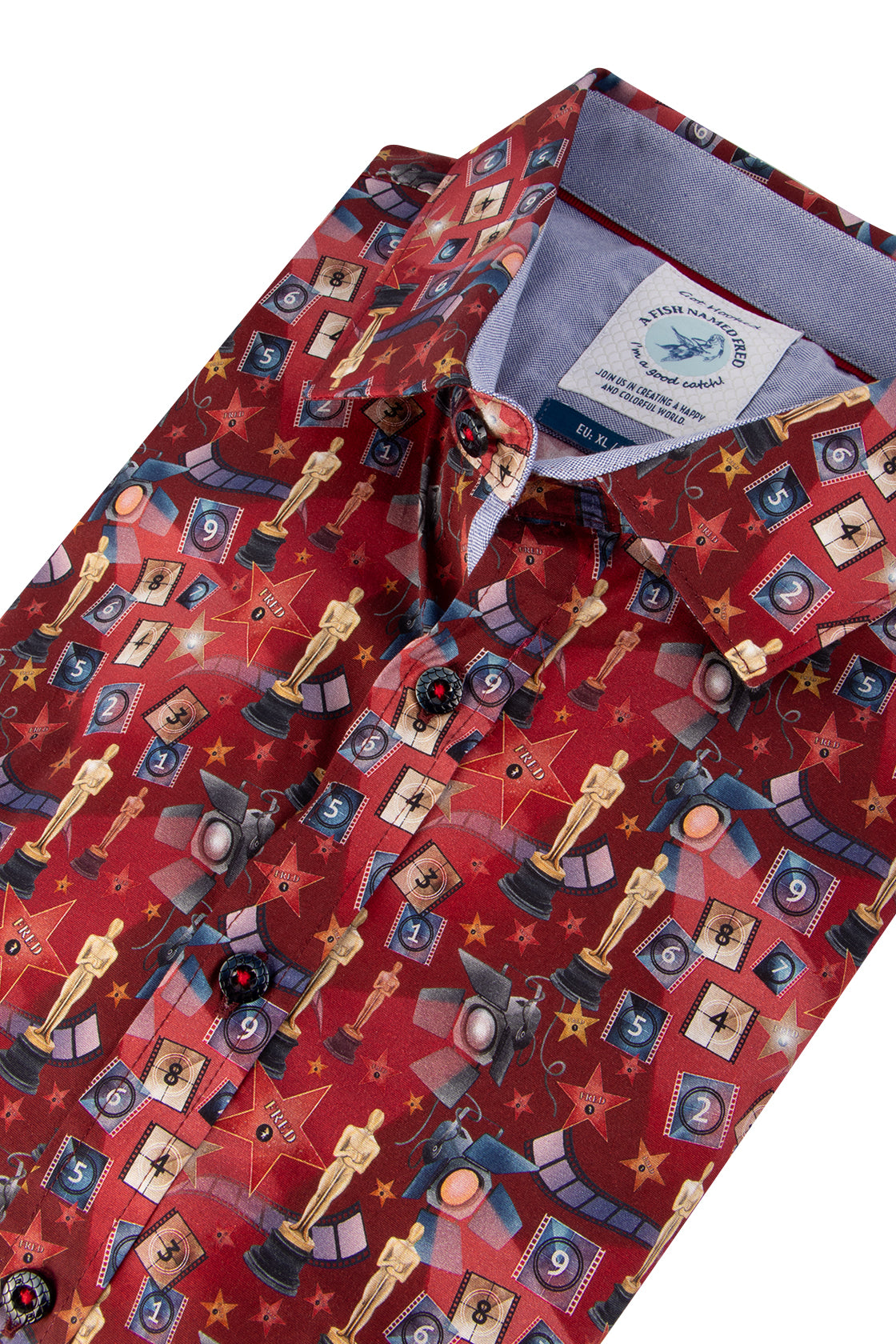 And the oscar goes tooo ...! This oscar shirt is a perfect conversation starter about award winning movies and actors. What’s the story behind this cool shirt? This shirt oscar has a modern fit and can be worn by all body types. It is made out of high quality fabric and has a classic button fastening. On the inside of the left cuff there is 'A fish named Fred' embroidered in colourful letters. At the bottom of the shirt 4 different colours of buttons are placed. These 4 buttons read ‘AFNF' which forms the initials for A fish named Fred. Hidden in the print design there is our logo fish, try to find it!