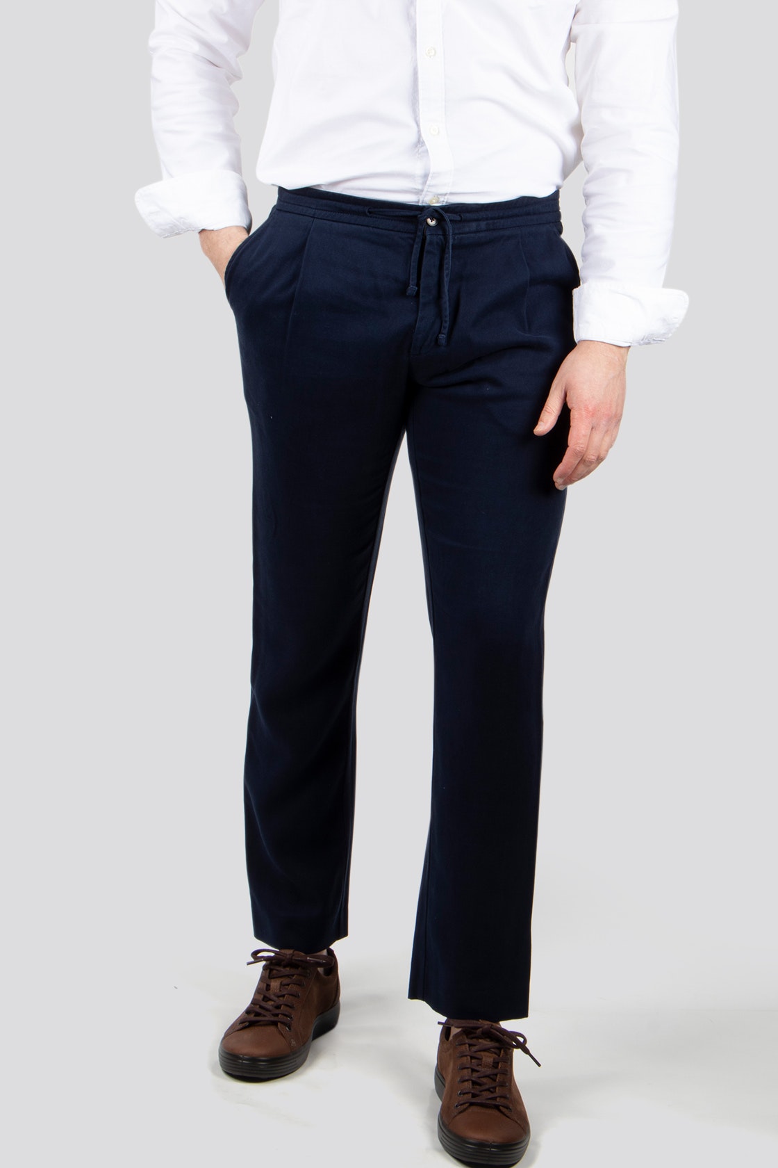 NN07 fuses Japanese perfection with Scandinavian simplicity. Led by founders and friends Victor and Ulrik, NN07 is dedicated to the design and development of clothes that stand the test of time. The Domenico chino in washed navy tencel is a slim fit. Featuring a drawstring for comforts, rear welt flap pockets and front side seam pockets.