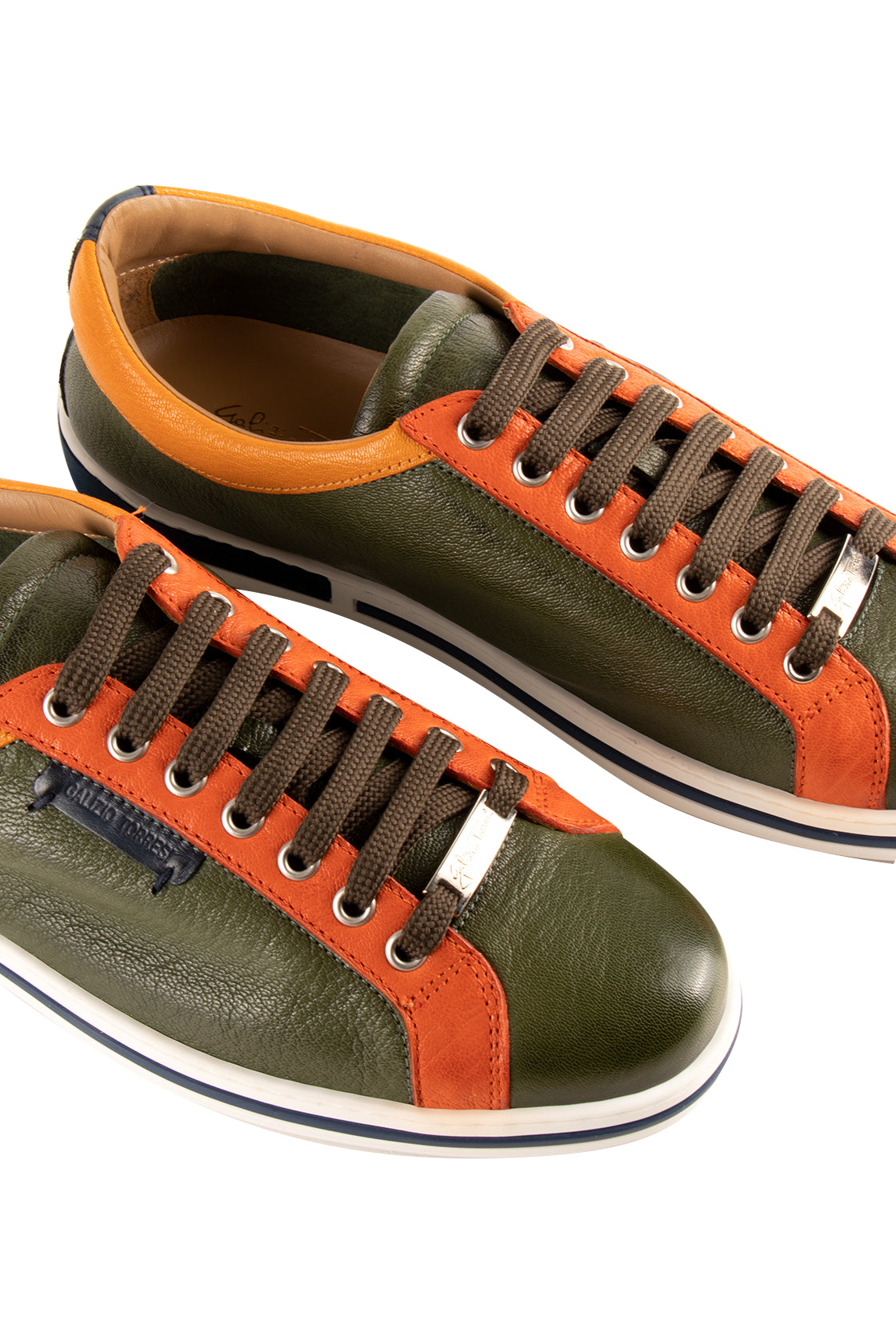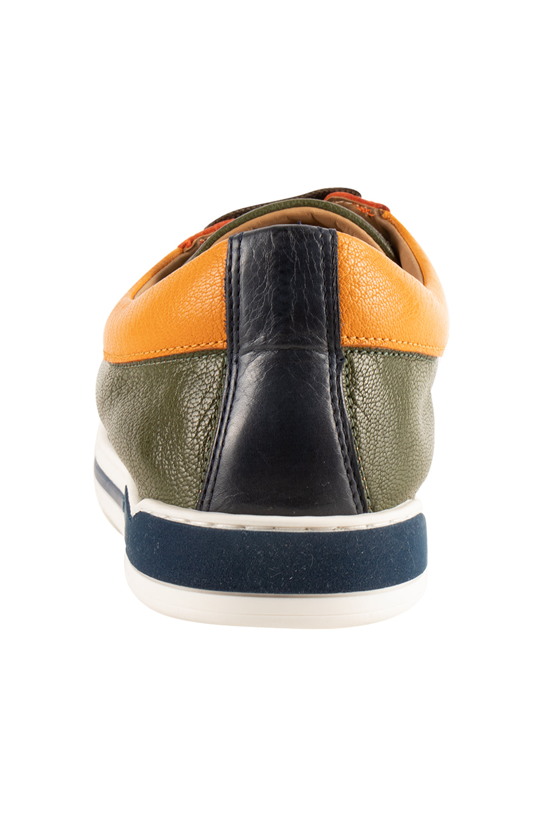 Soft leather sneaker in green, organge, navy and yellow accented by a white sole.
