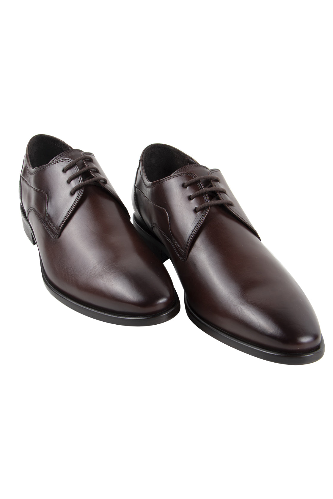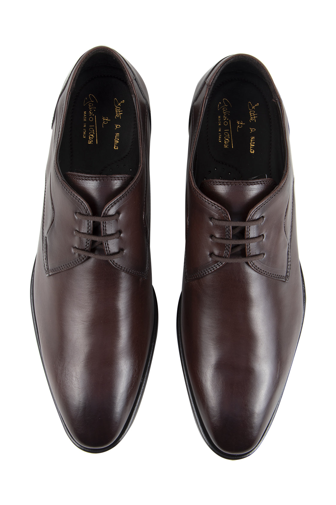 Chocolate leather lace up derby shoe with leather lining and rubber sole.