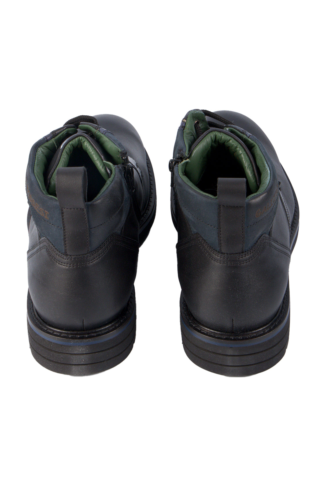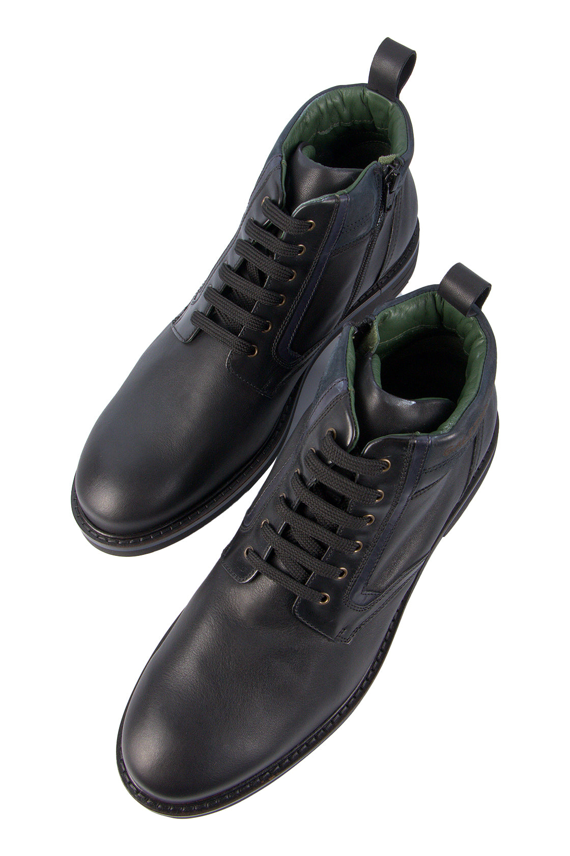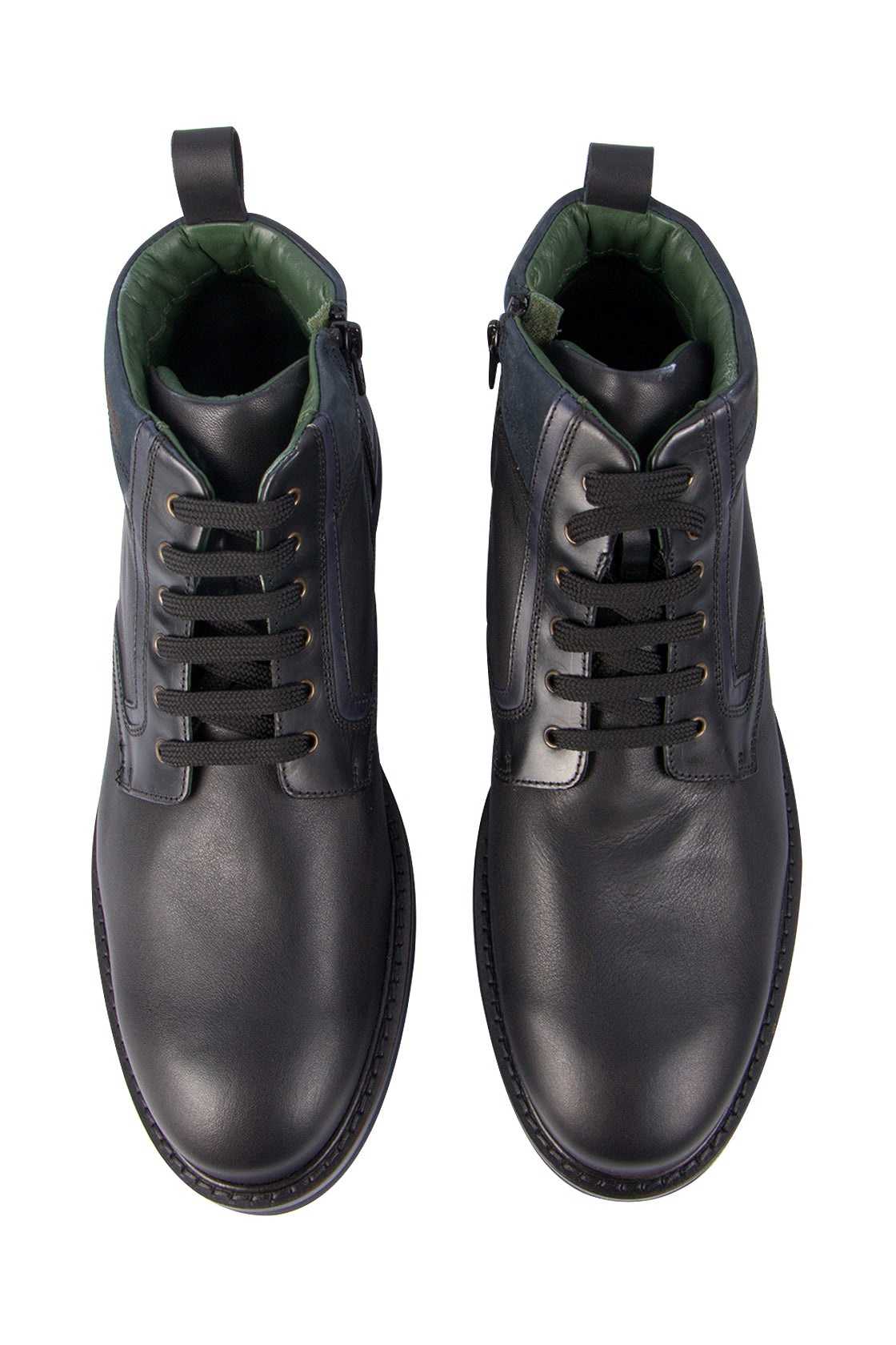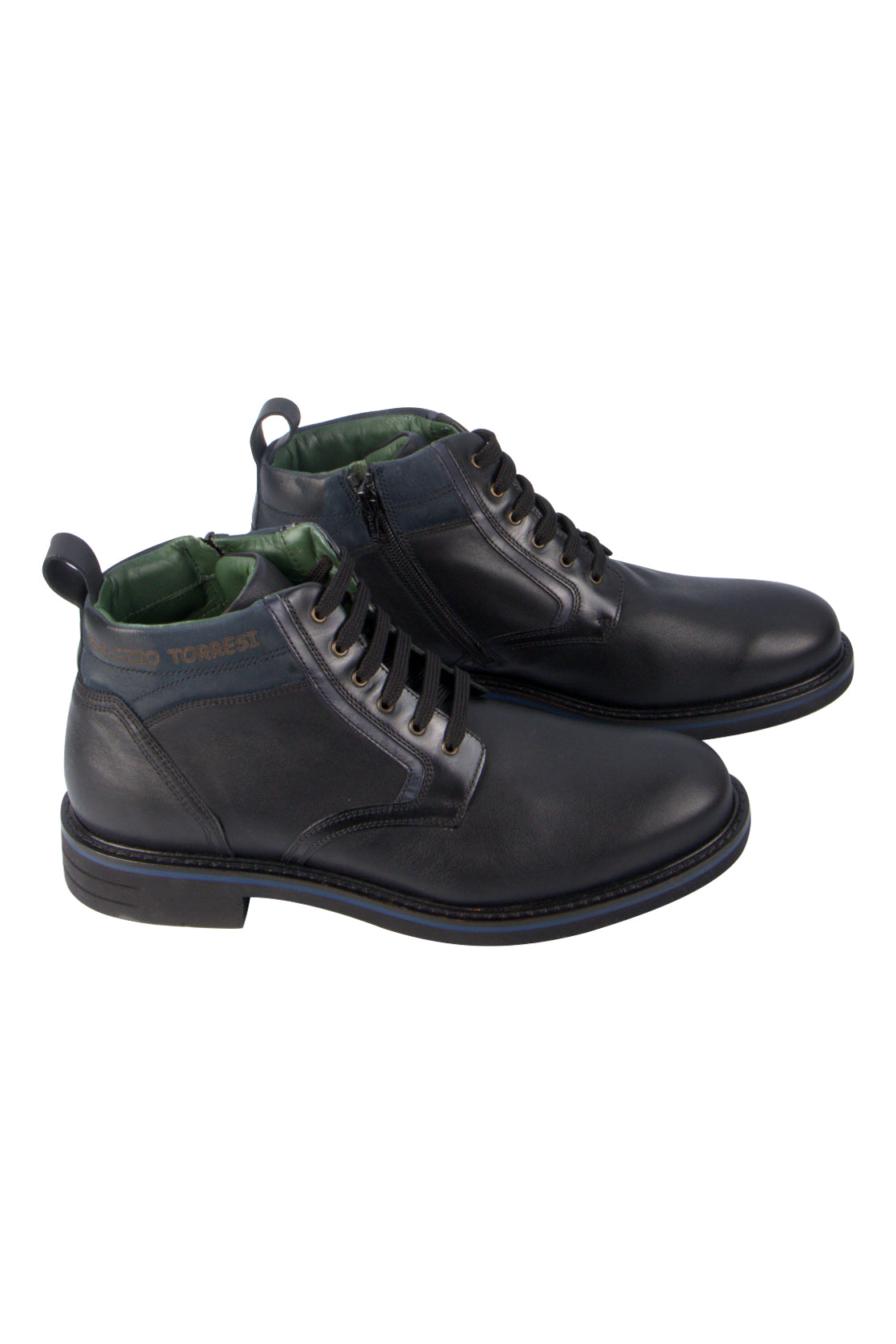 Leather lace up ankle boots in black and navy with padded ankle collar and pull tab. Leather lining and rubber sole.