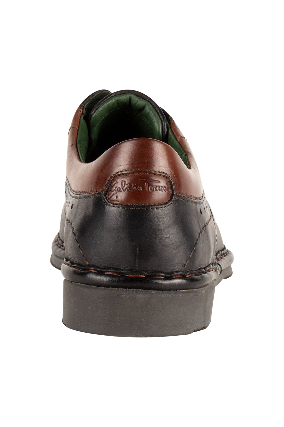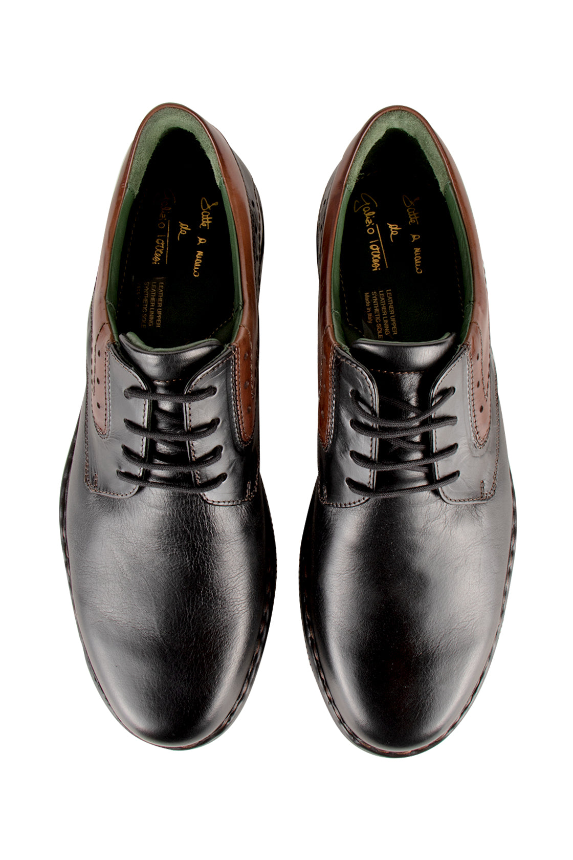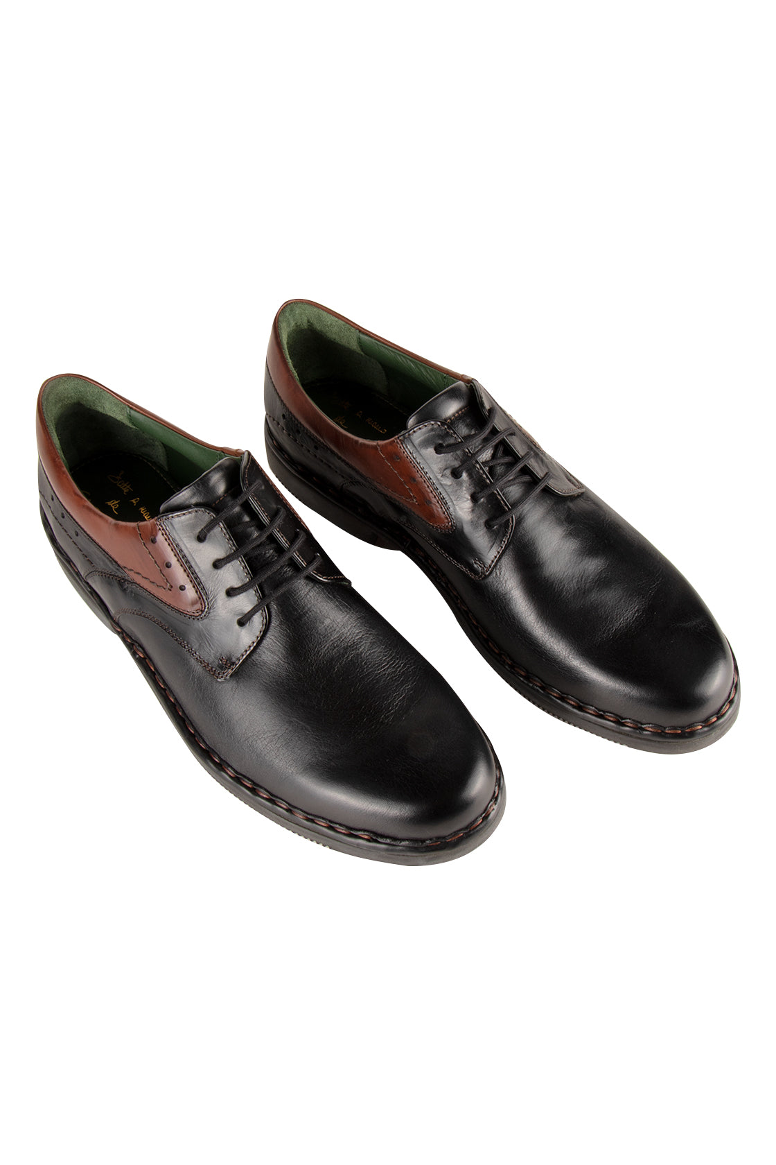 Black leather dress casual shoe with brown leather accents and padded ankle collar.