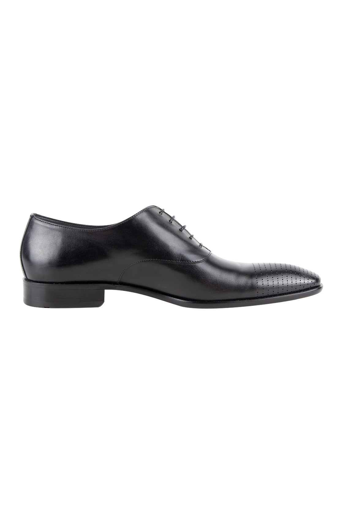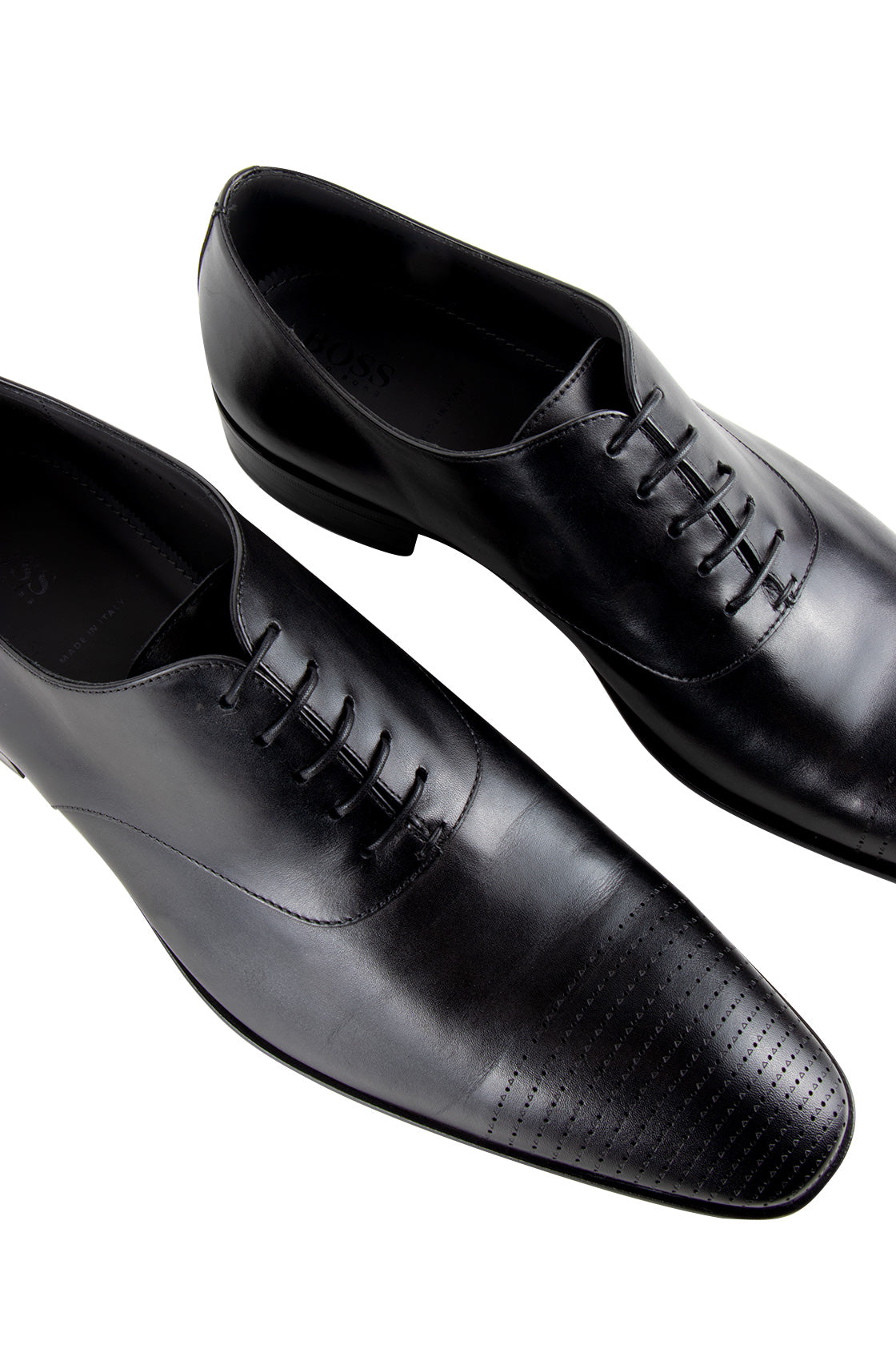The Hugo Boss Certeo is a black leather oxford shoe with perforated detailing across rounded toe.