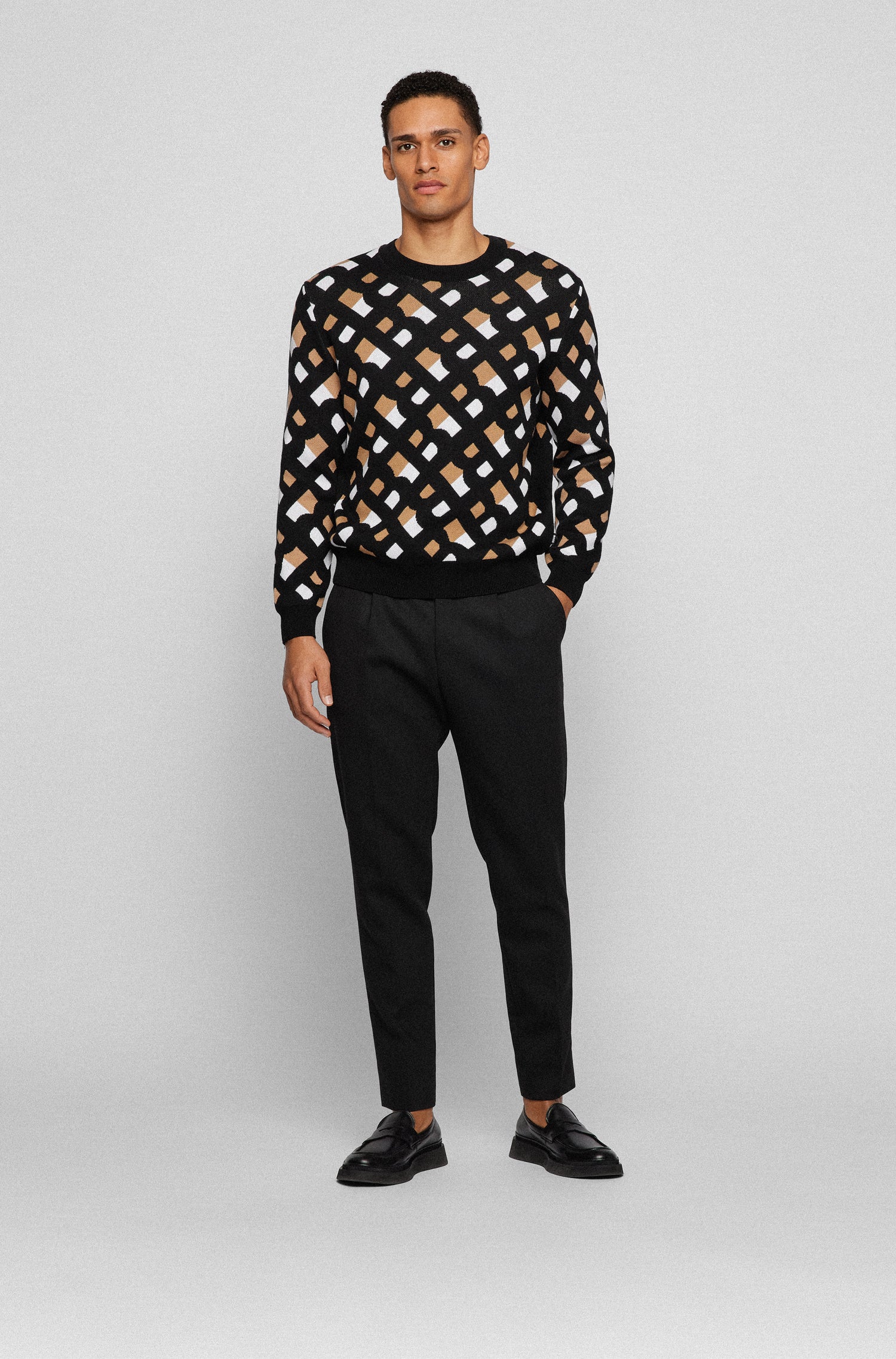 An impeccable sweater by BOSS Menswear. Solid trims at the hem, cuffs, collar and side seams frame this masculine piece.