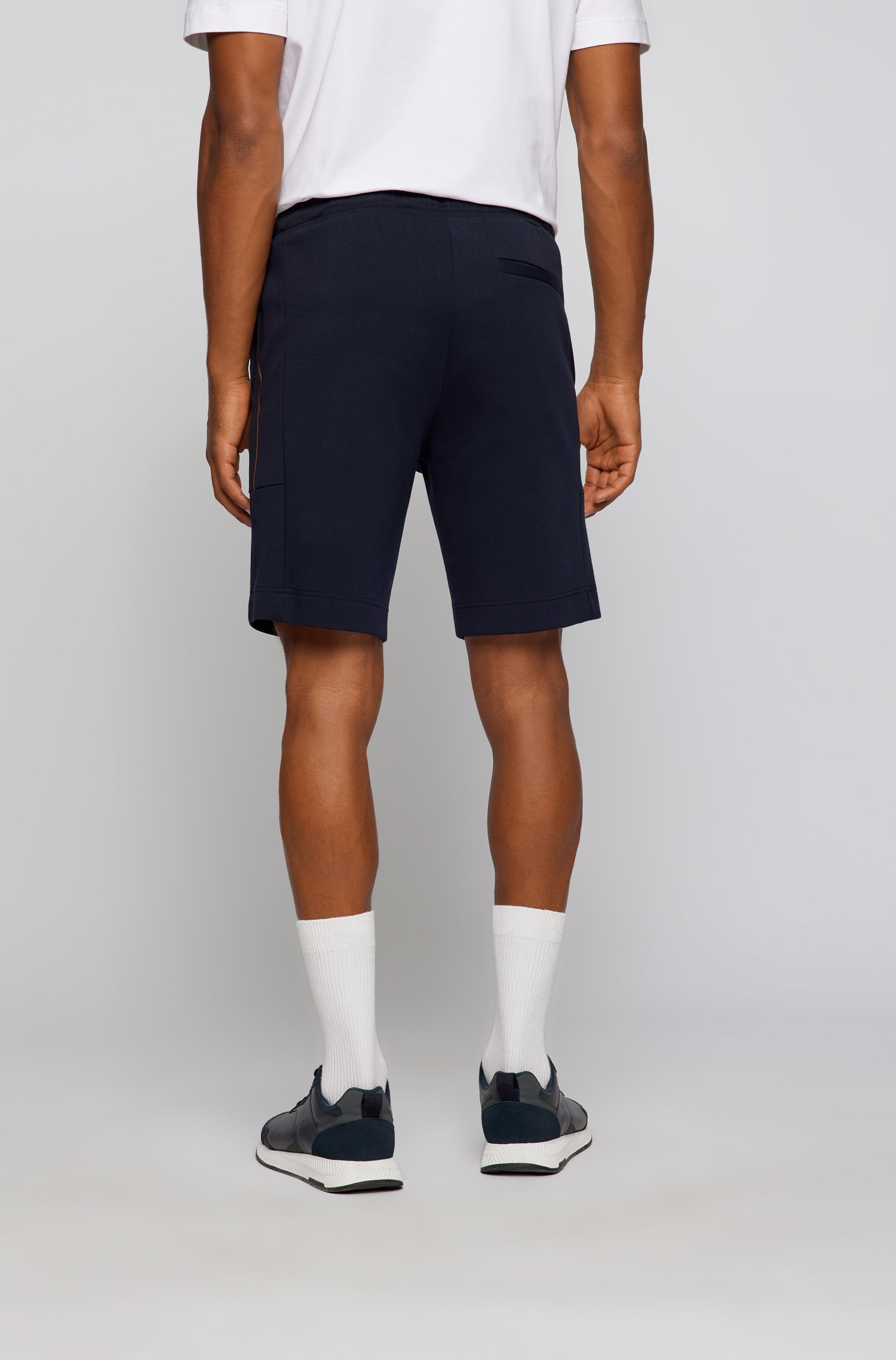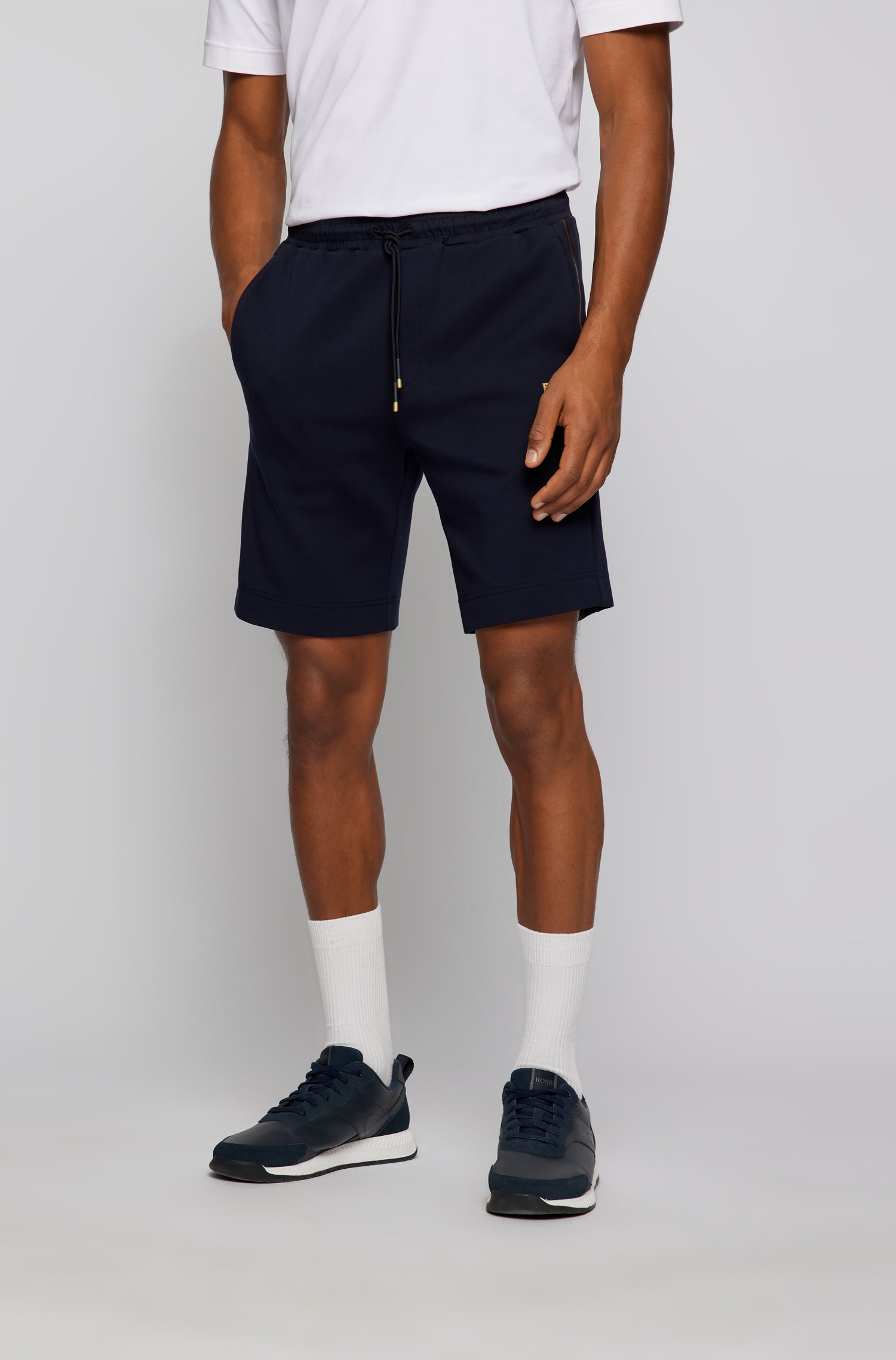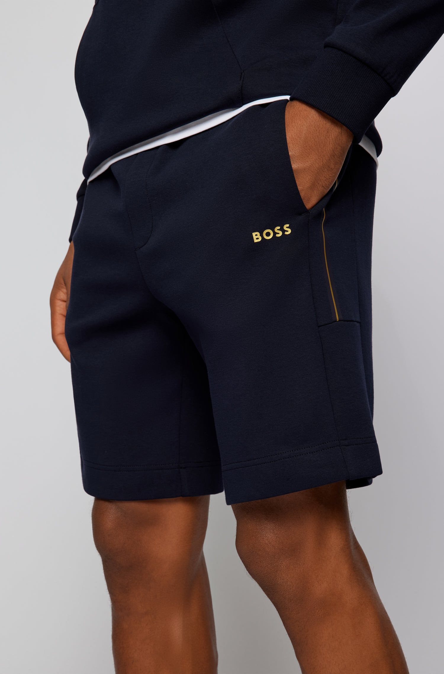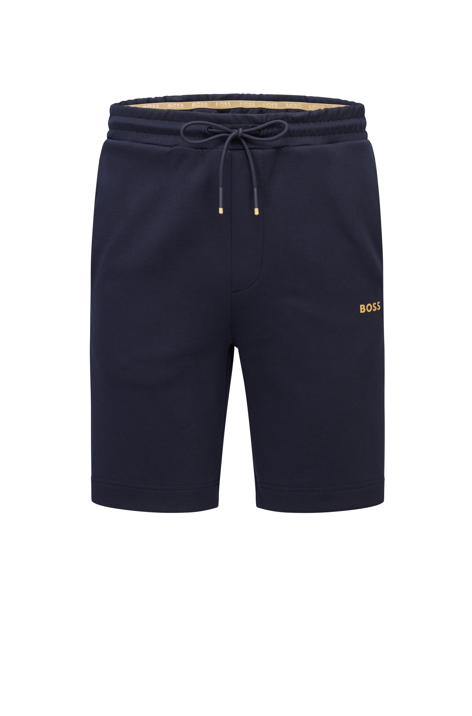 Hugo Boss men's Athleisure regular fit Headlo shorts. Two side pockets, one back pocket and drawstring for adjustable comfort. Featuring a gold BOSS logo to the thigh and gold taping down side of legs and made from stretch fabric blended with cotton.