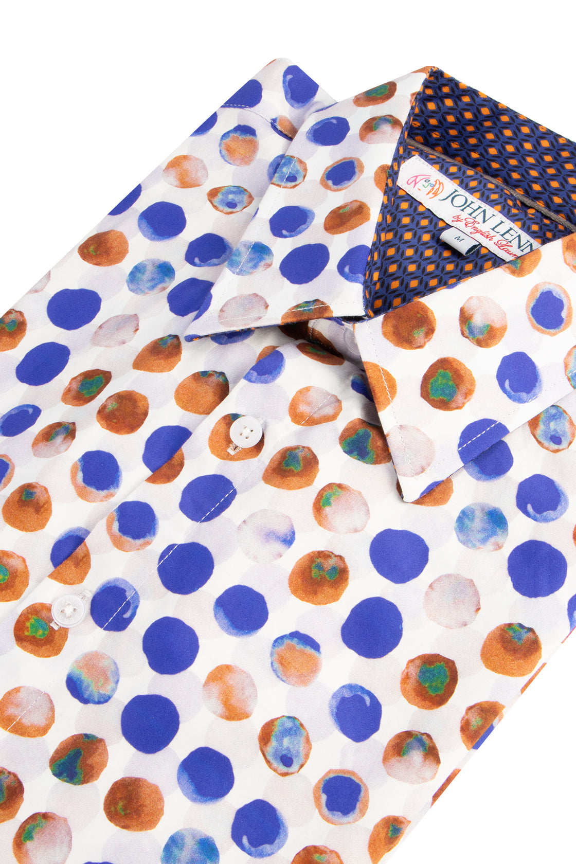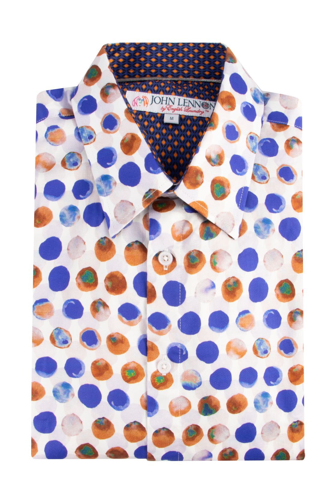 The limited edition range of John Lennon shirts by English Laundry are inspired by the musical legend's very own sense of style. An artistic take on the classic polka dot shirt featuring painterly motifs in vibrant blue and orange with matching geometric trim. Featuring signature contrast trim, John Lennon embroidered motif and peace-sign buttons.