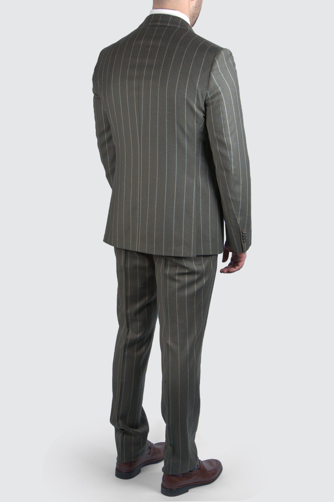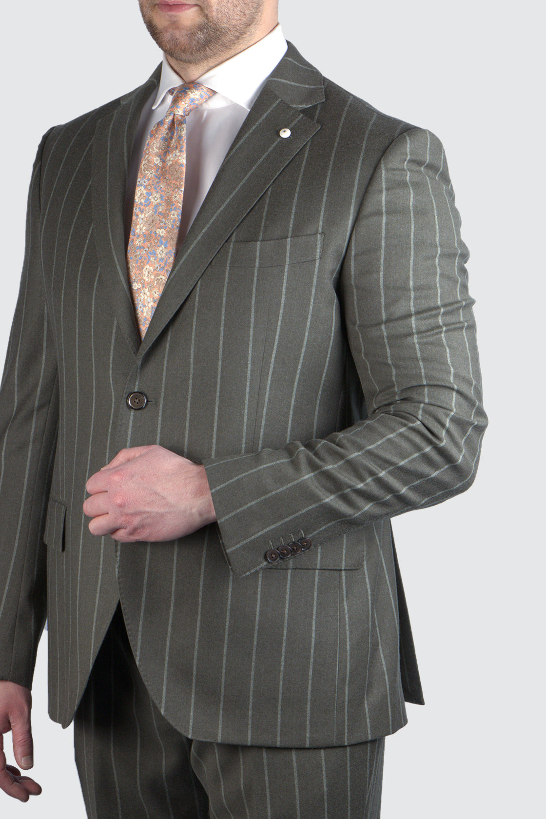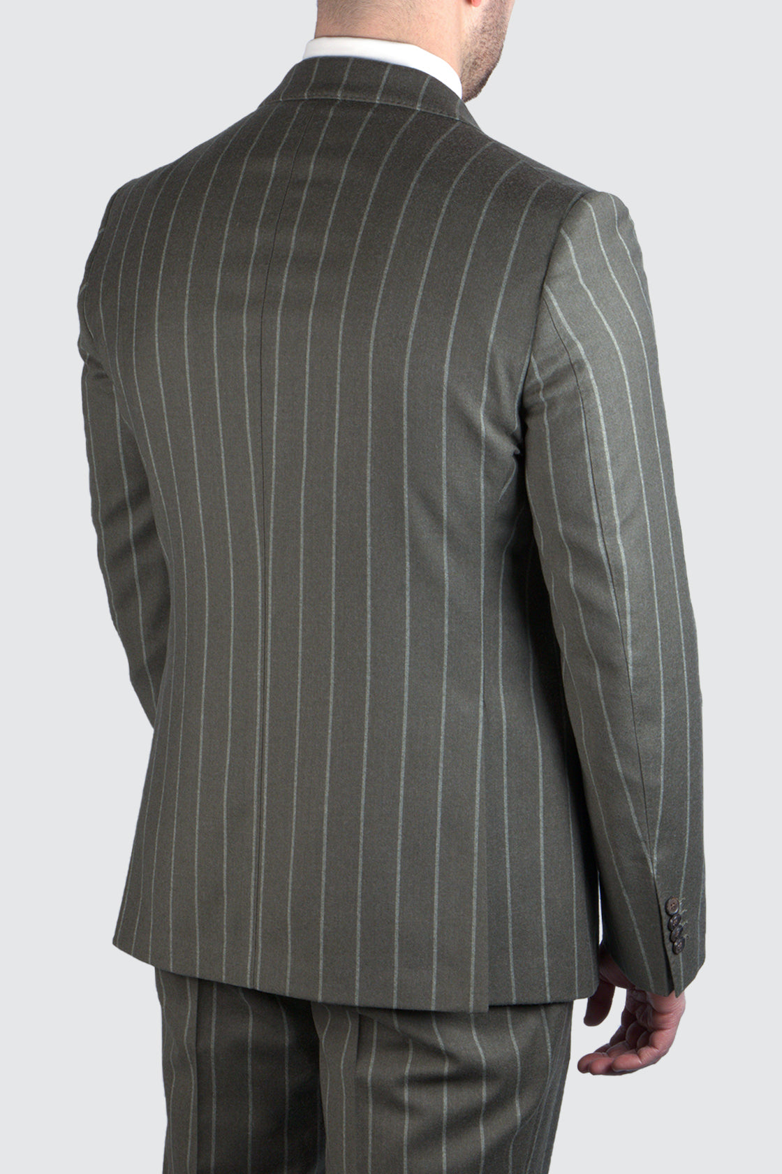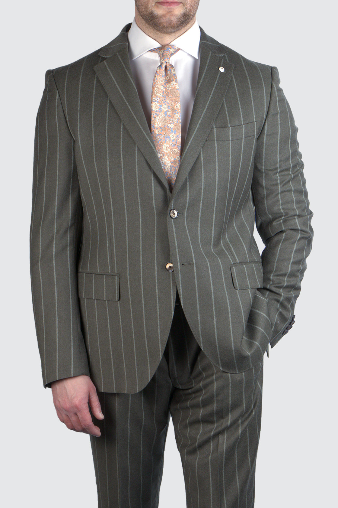 Virgin wool single-breasted suit in mid green. Thin pinstripes create a look of timeless elegance. Flap pockets and side vents ensure practicality and ease of movement. Comfortable, versatile flat-fronted pants complete the look.