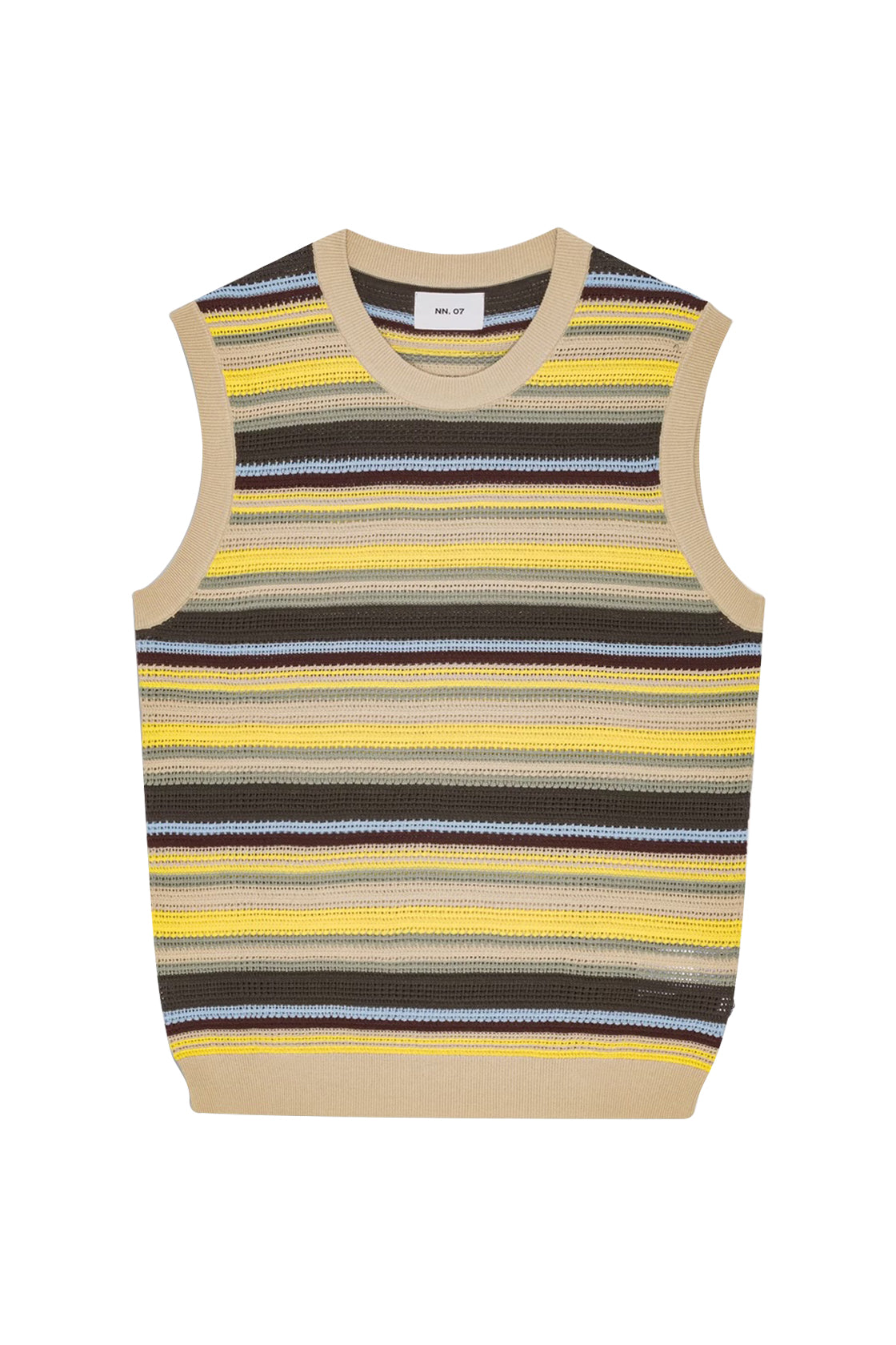Knitted organic cotton tank top by NN.07 in an open stitch using a high twist yarn with a textured surface and complete with rib knitted edges.