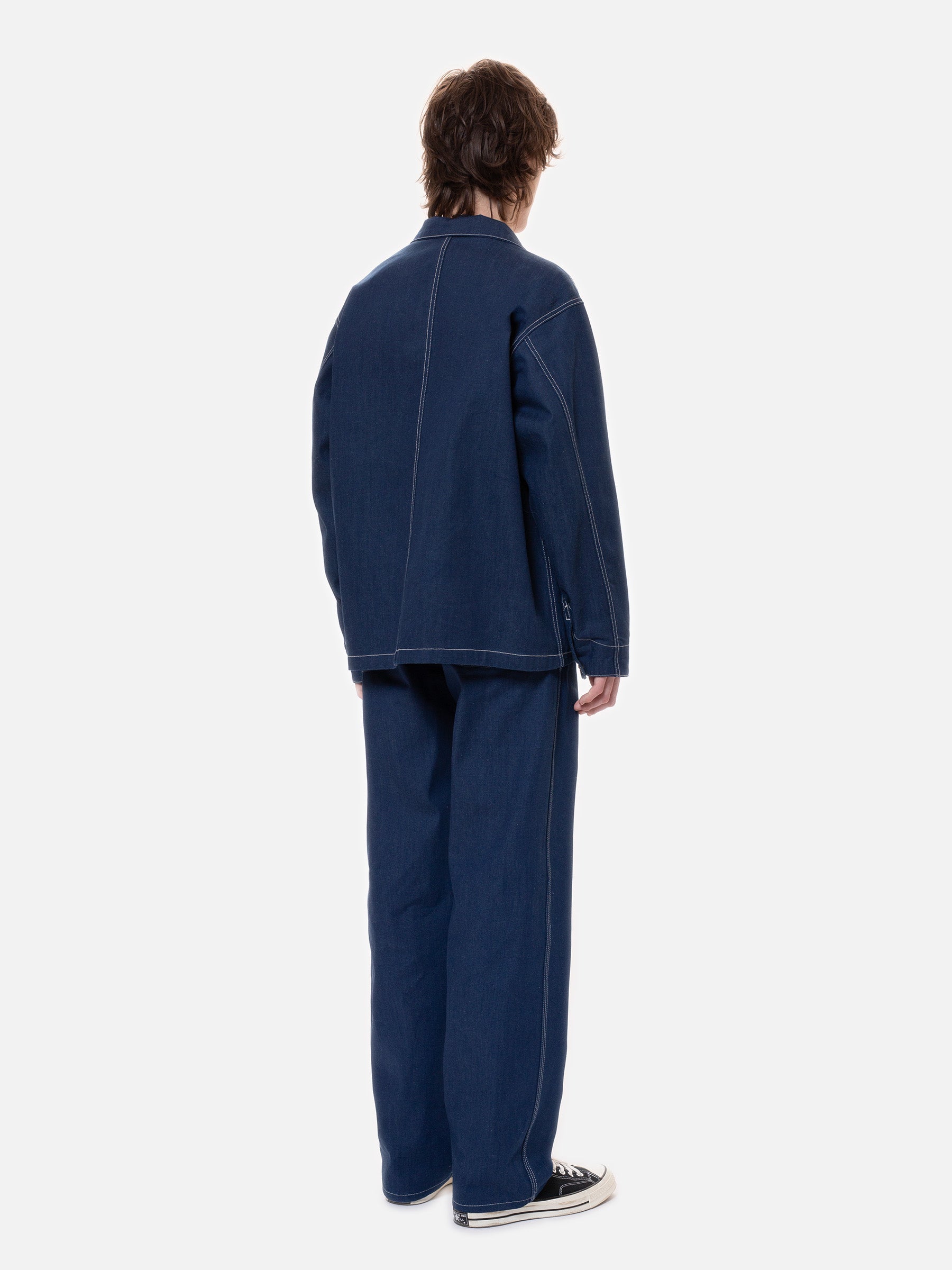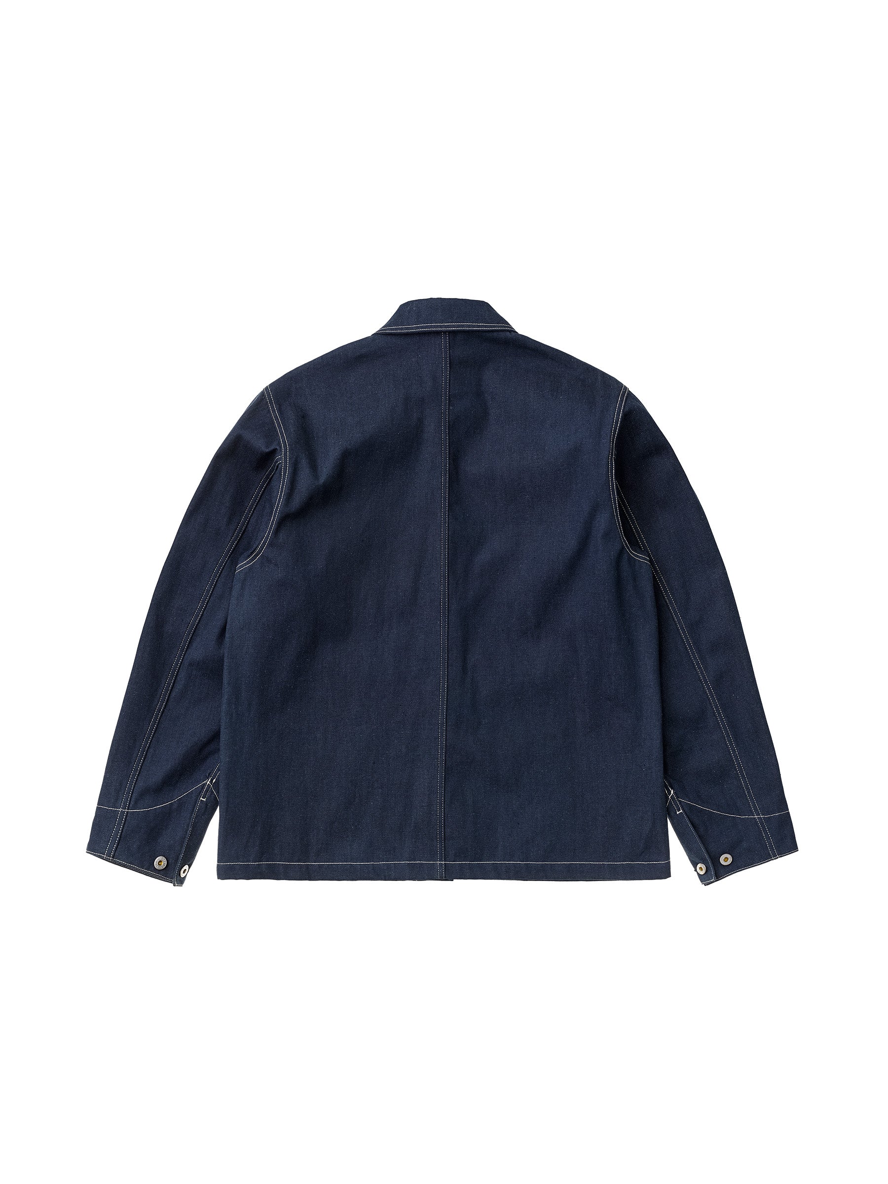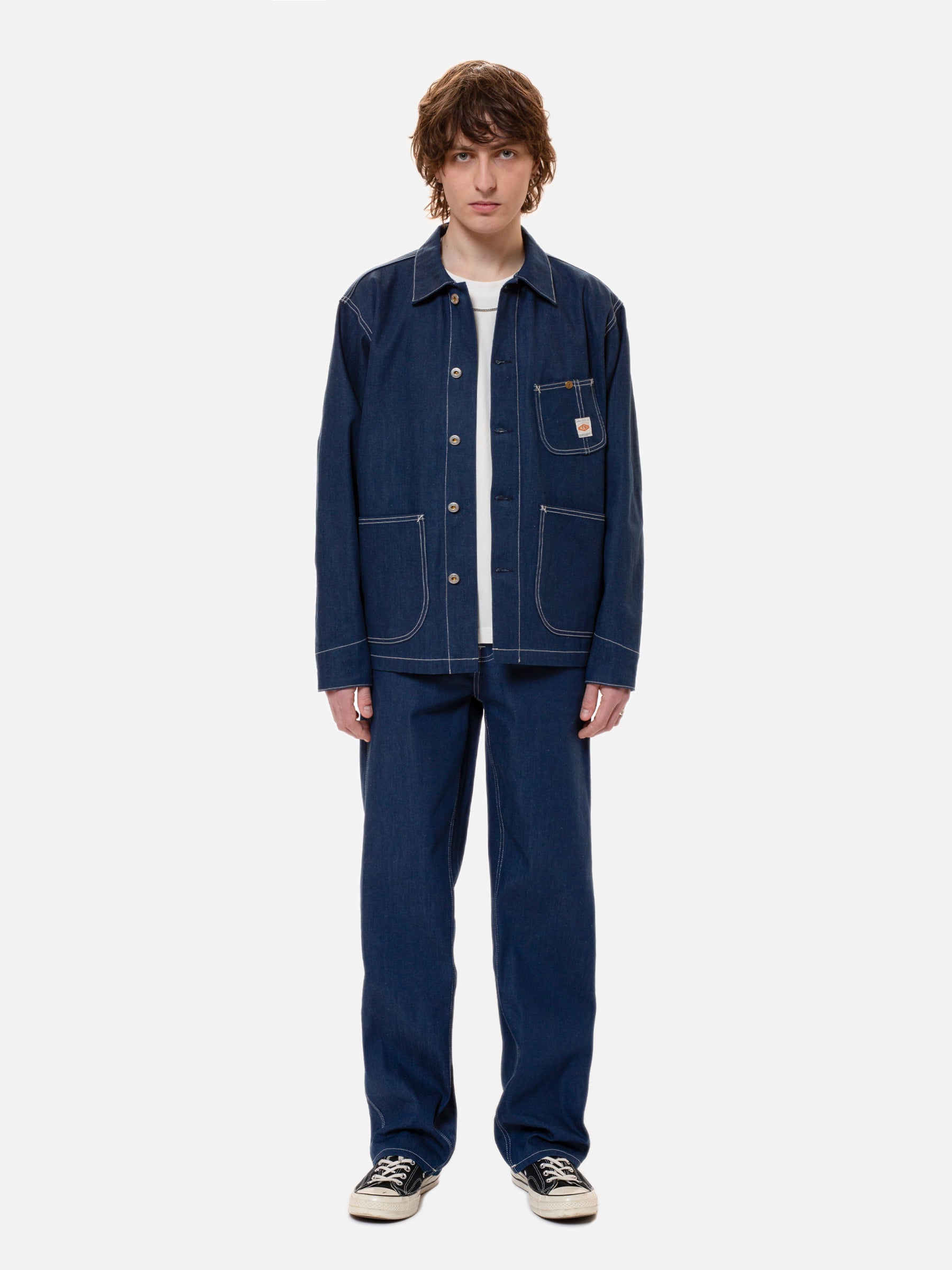 Chore jacket made from recycled, worn-out Nudie Jeans and certified organic cotton. The overall fit is generous, like every good worker's jacket should be. This one features big, beautifully shaped patch-on pockets and a nifty chest pocket. The denim is our take on the denim of the best chore coats, dungarees, and carpenters' pants from the 1930s, which utilizes fine, high-twist yarns together with a 2/1 Z-construction.