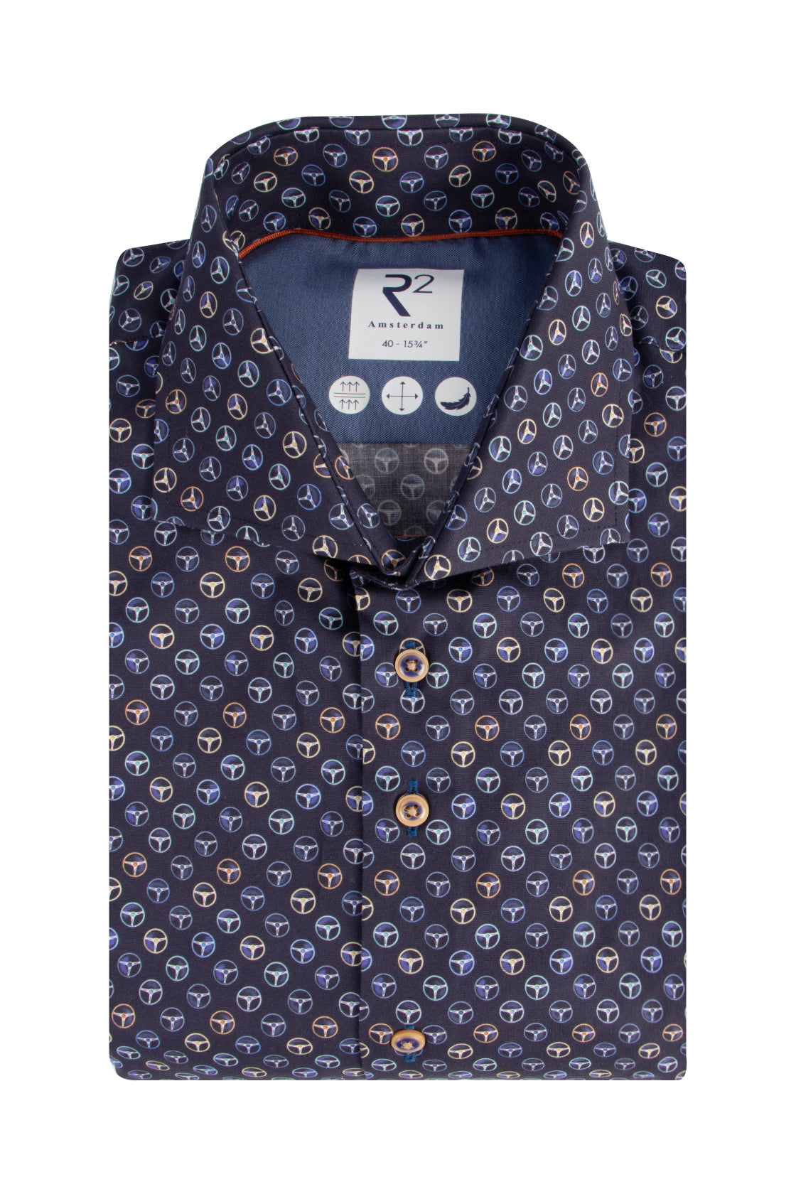 R2 Amsterdam provides the shirt you have been looking for. Made from high quality Italian fabric and finished with the most creative details to make each shirt one of a kind. This R2 shirt features a geometric pattern of small steering wheels in pastel colours of blue, teal and tan on a navy background.