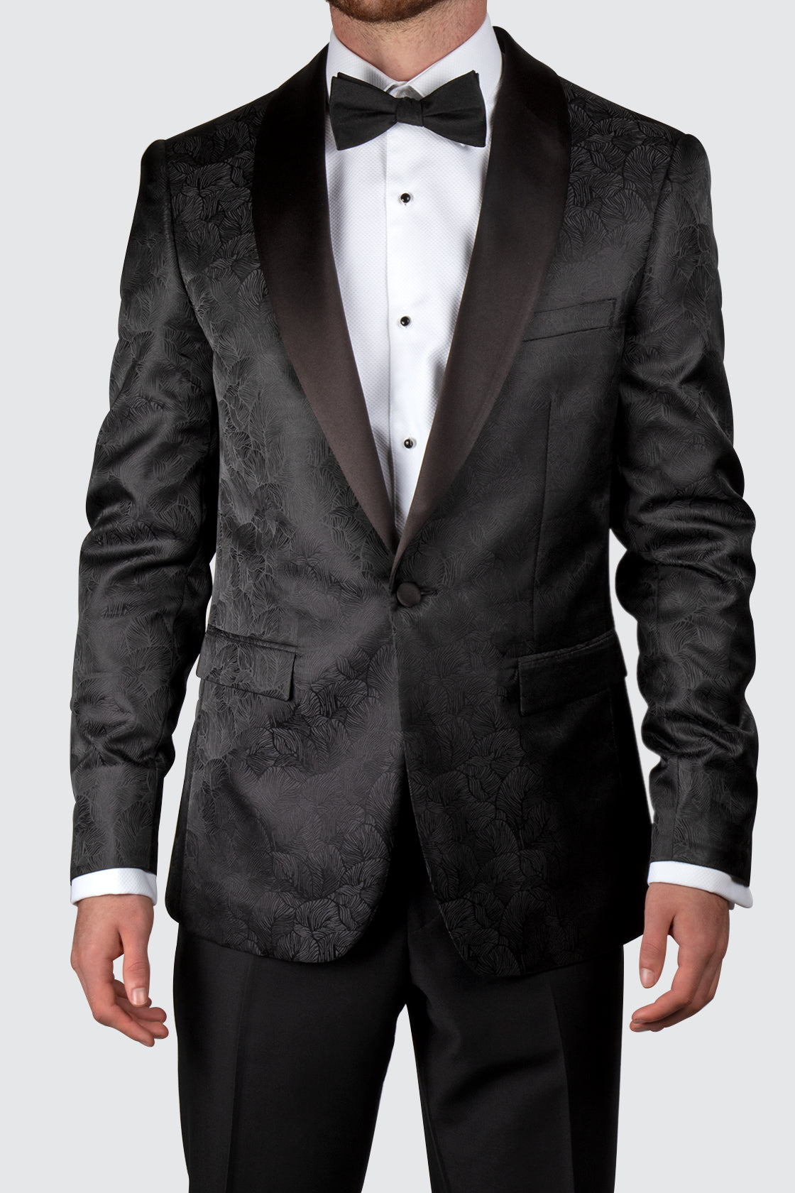 Explore the Routleys Shawl Dinner Jacket—an exquisite slim-fit silhouette with a shawl lapel, single-button closure, and a captivating stenciled leaf pattern.